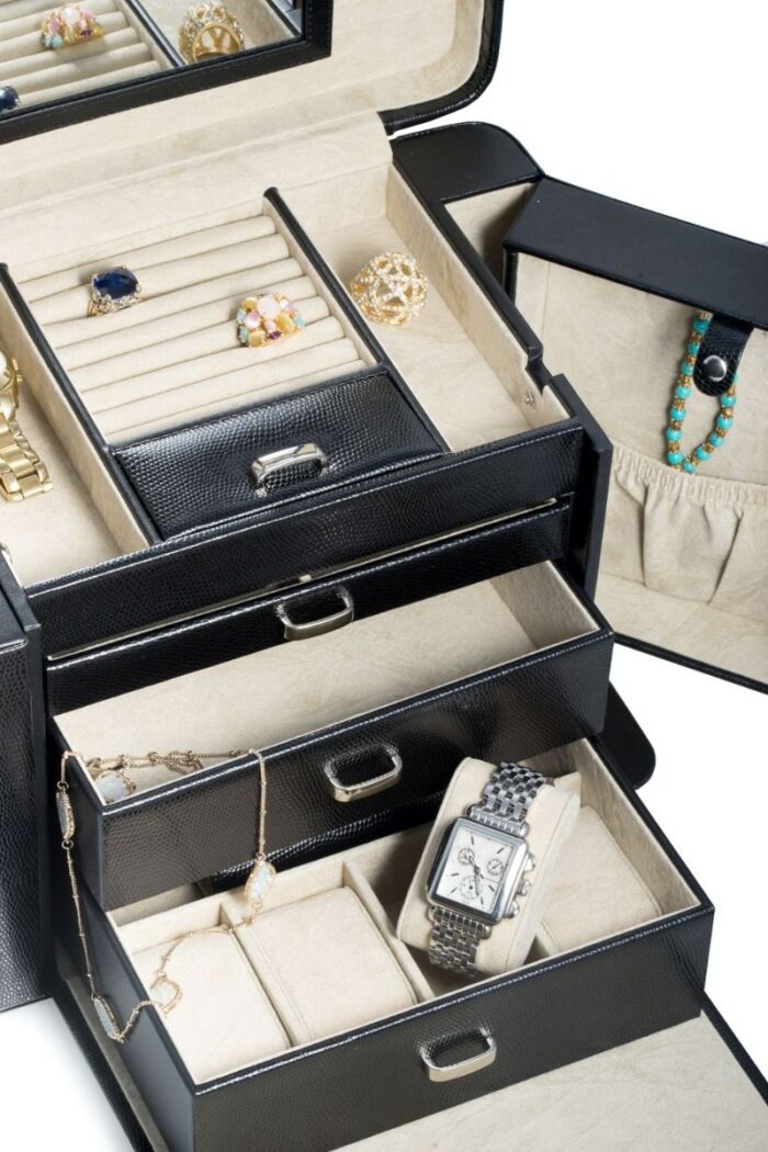 Sophisticated black lizard leather chest with 4 levels of smart organization. Mirror, velour lining, fold-out necklace hooks, and bonus travel box included. Perfect storage for any collector.