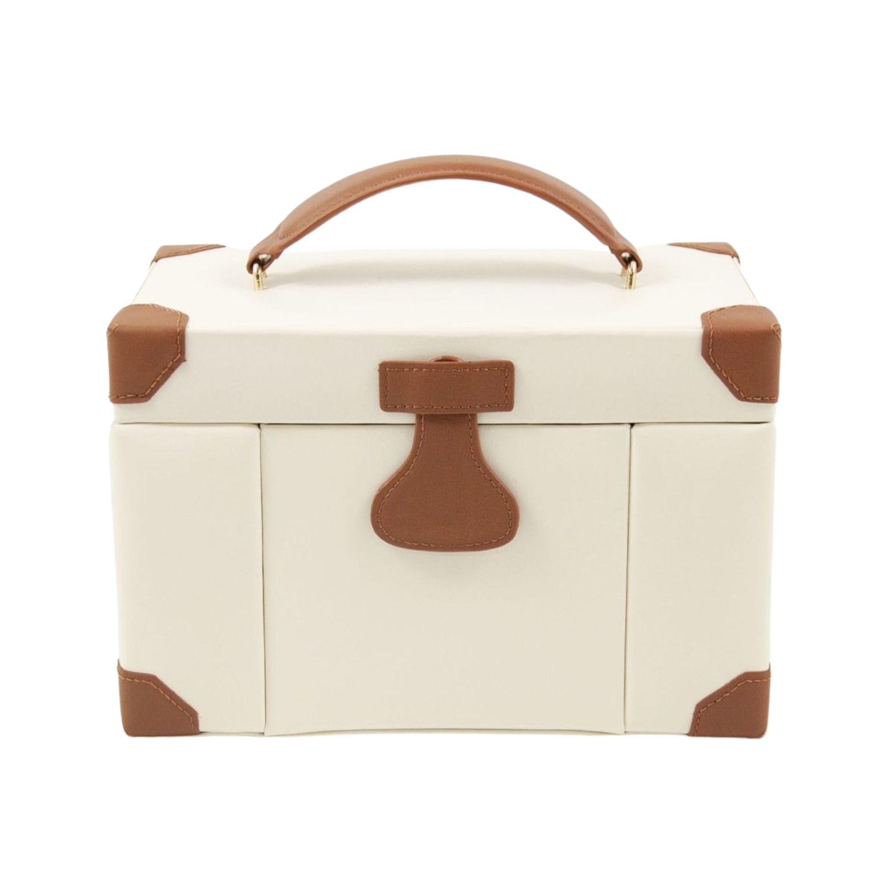 Four-level ivory leather jewelry box with surgical precision organization. Dozens of compartments prevent tangles. Three drawers plus removable travel case. Built-in mirror.