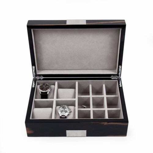 Lacquered ebony burl wood with steel accents. Holds 4 watches, 12 cufflinks. Velour lining prevents scratches. Transform bedside clutter into luxury presentation.