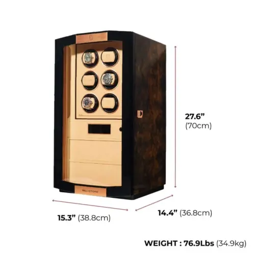 L. 15.3″ × W. 14.4″ × H. 27.6″ (388 × 368 × 700mm). This watch rotating box occupies real estate in your home – and earns every inch.
