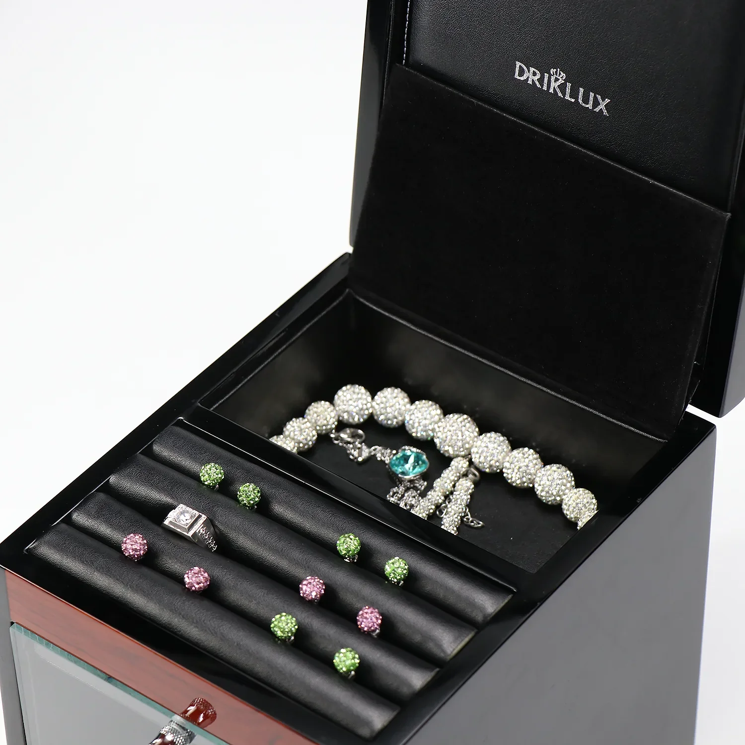 • Top storage compartment – Secure space for additional pieces or jewelry