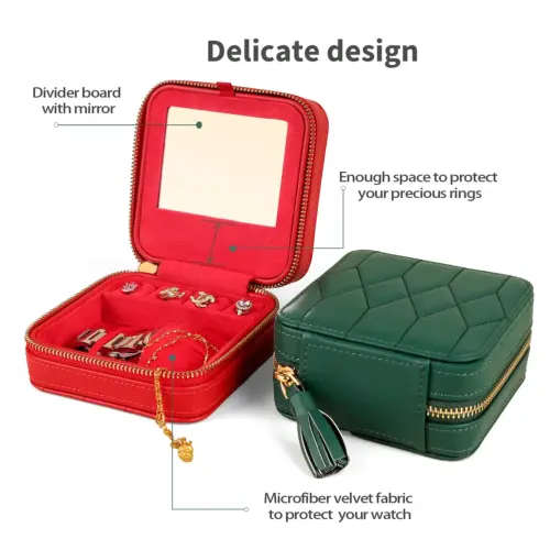 • Two-chamber layout – One side holds your watch securely, the other organizes up to 3 necklaces and 7 rings