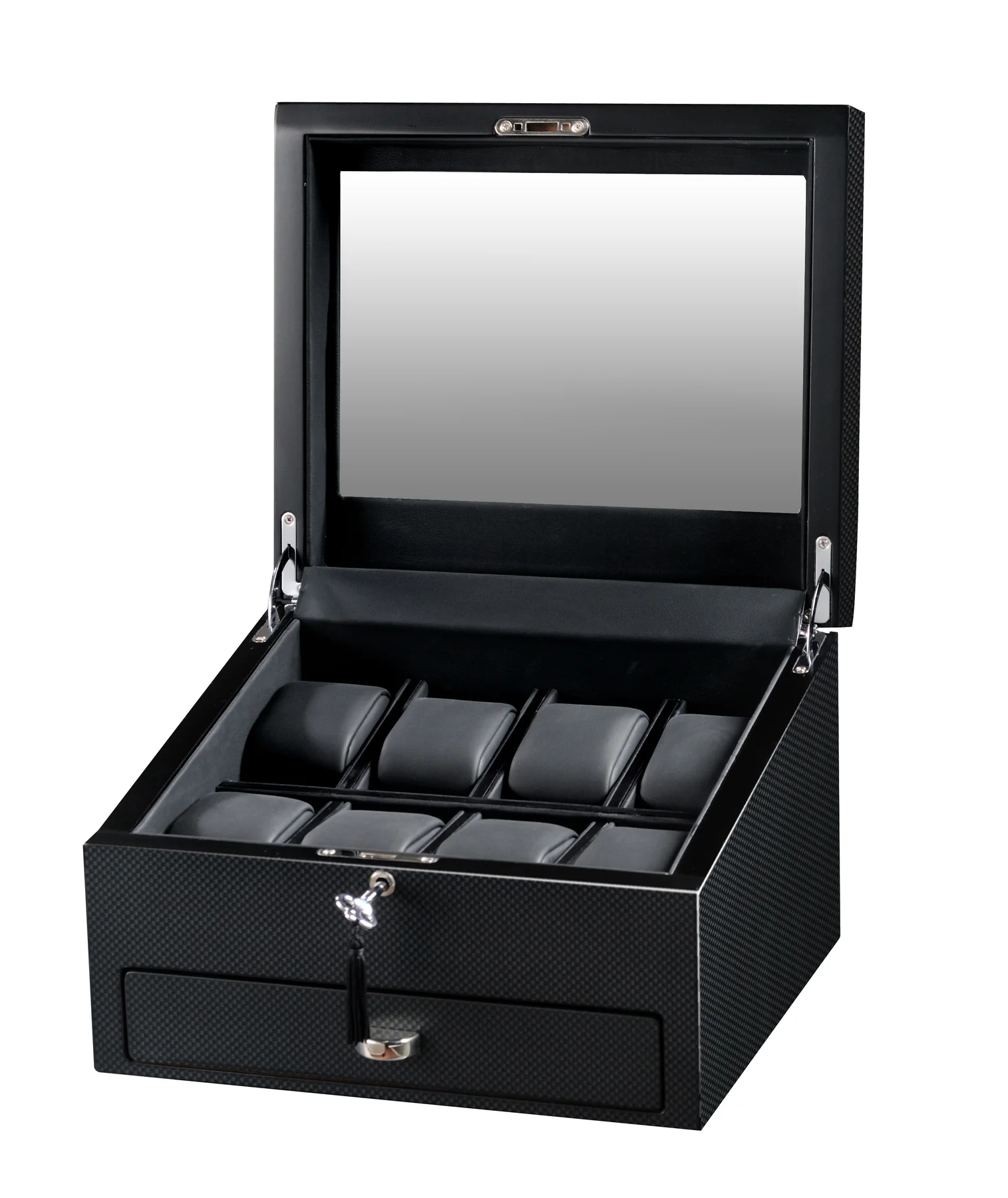 The supplied key locks the watch compartment. Your expensive timepieces stay protected whether you’re home or traveling.