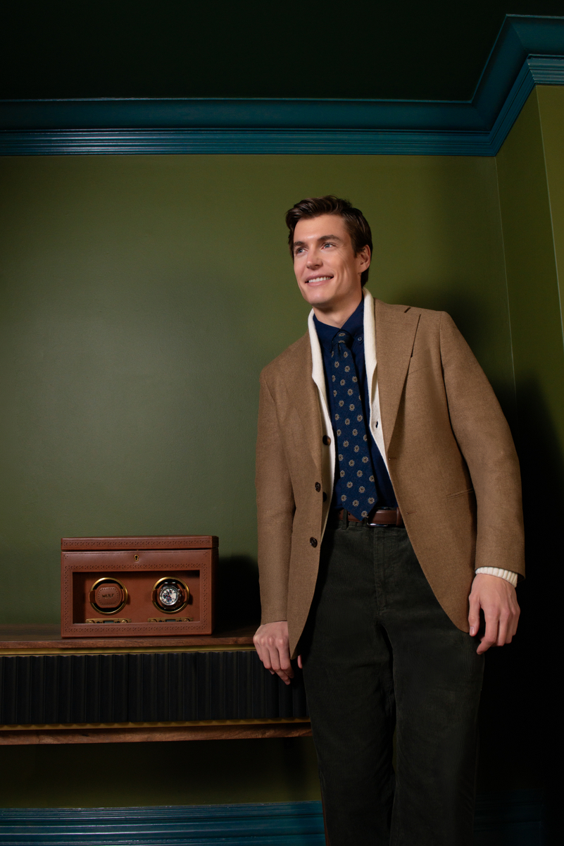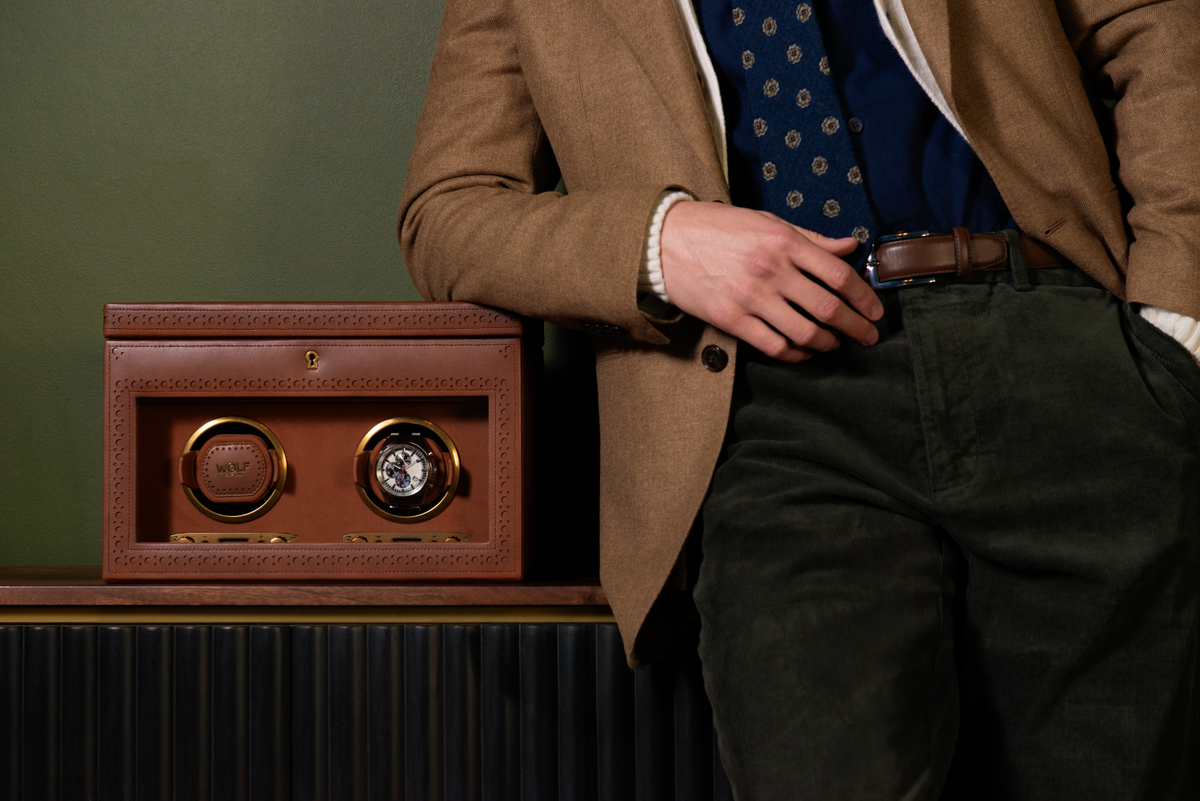 WOLF’s Brogue collection doesn’t just store your watches — it makes a statement about how seriously you take them. Crafted from burnished plant-based material and finished with Old English brass hardware, the Brogue draws inspiration from classic British brogue shoes. The result is a watch winder that looks as considered as the timepieces inside it.